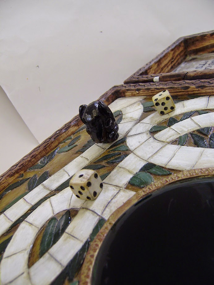 Designer mega talentosa, Gemma Wright esculpe em madeira todo o tabuleiro do filme e suas peças com detalhes incríveis, desde o tabuleiro aos dados, portinholas para guardar as peças jogáveis em forma de animais, os avisos, as casas (TUTO!).